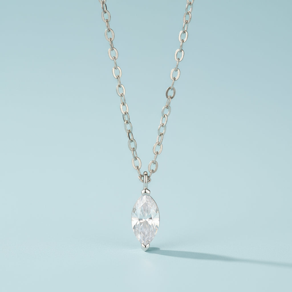 Sa chaîne fine en argent 925 met en valeur la pierre taille marquise avec un éclat pur. Hypoallergénique et résistante, elle apporte une touche de modernité et s’accorde à toutes les tenues, du quotidien aux grandes occasions.